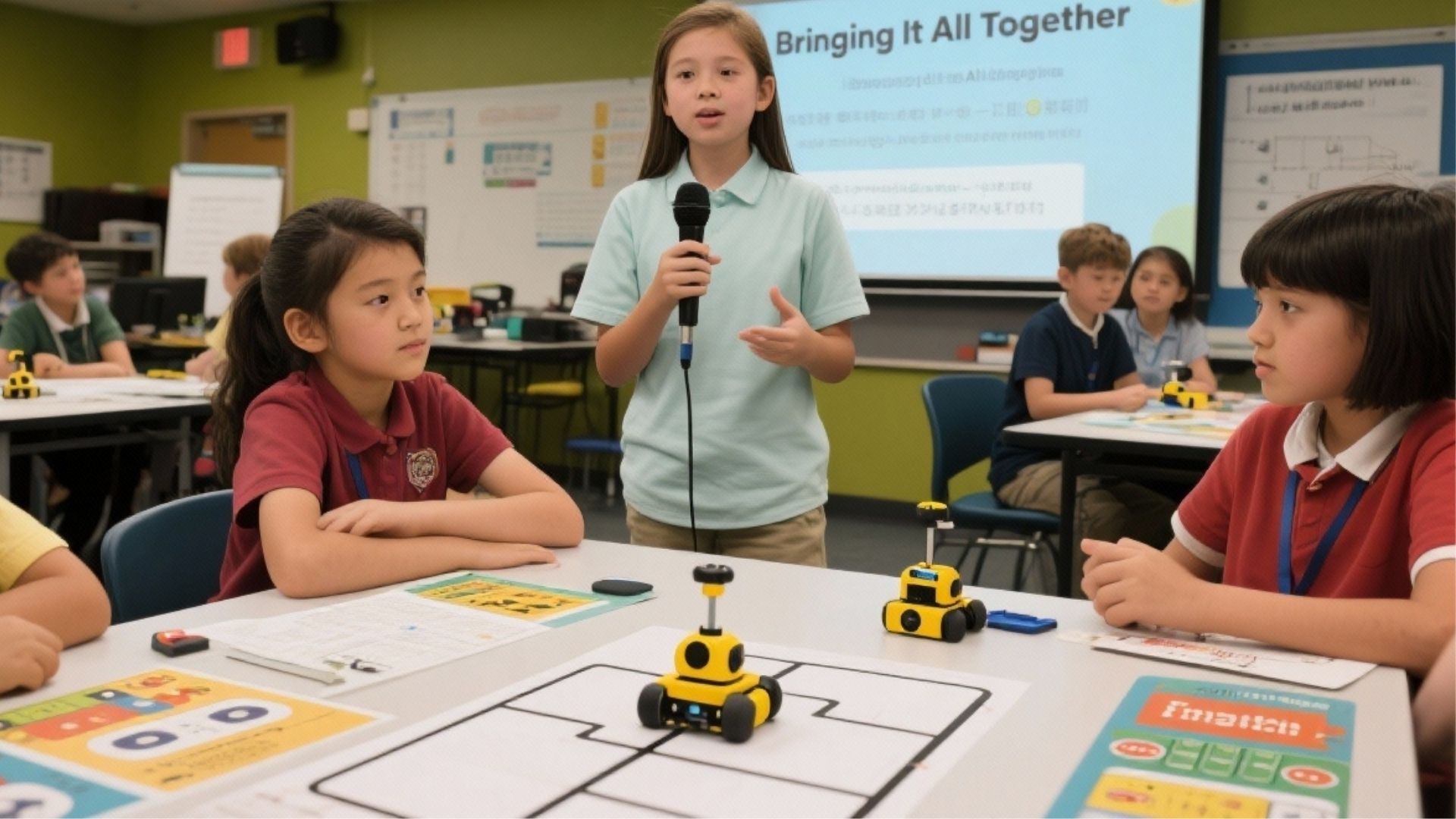 围绕“Bringing It All Together”主题开展轮换式工作坊:打磨小组展示脚本与演讲表现力,利用 Bee-Bot 等工具进行基础编程与路线设计,并创作与本营主题相关的英语互动游戏;让学生在多种表达形式中整合一周所学,为最终展示做好语言与创意准备。