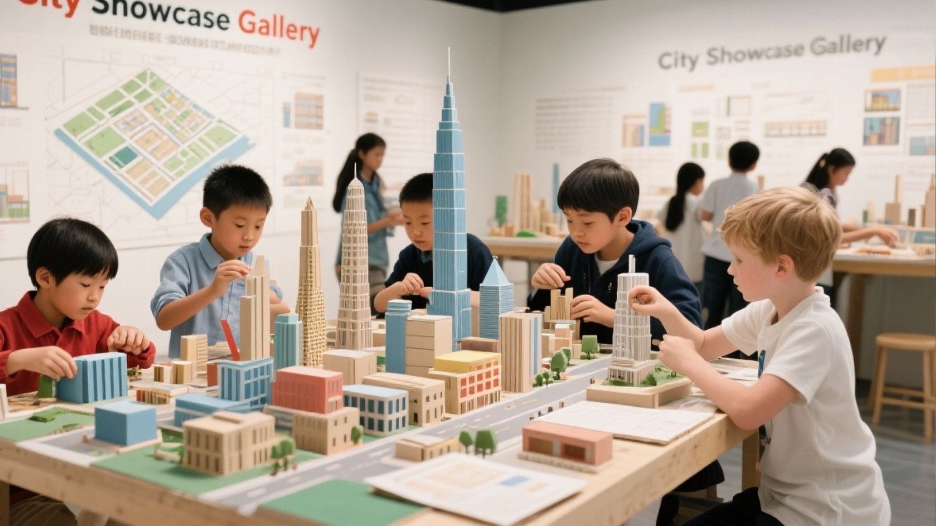 立面图和光学构想,学生分组正式动手搭建 3D 城市模型,使用多种材料构建地标建筑与街区场景;在 “City Showcase Gallery” 中进行小范围展览和同伴互评,在真实项目实践中体验计划